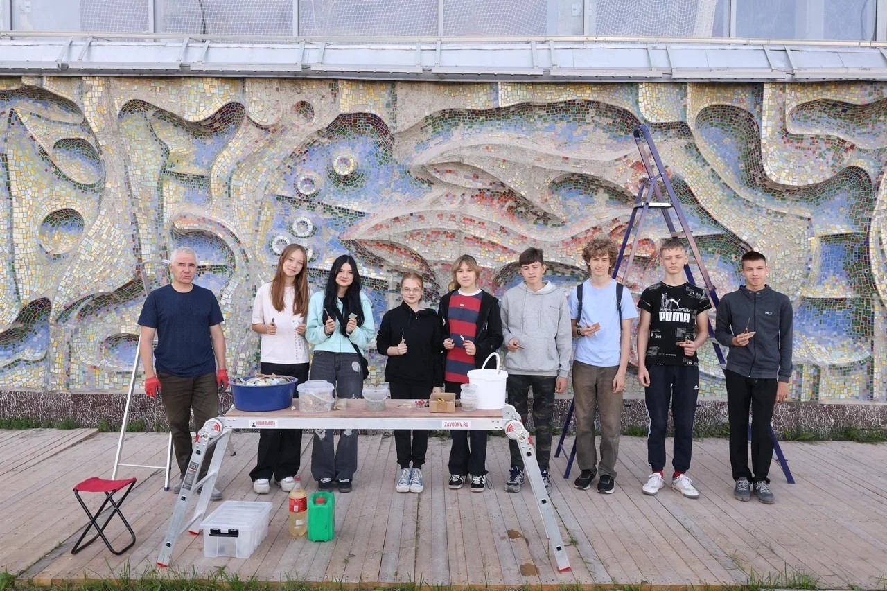 Реставрацию части мозаичного полотна с начала августа ведет Школа реставрации мозаик при поддержке Правительства Нижегородской области и Фонда президентских грантов.