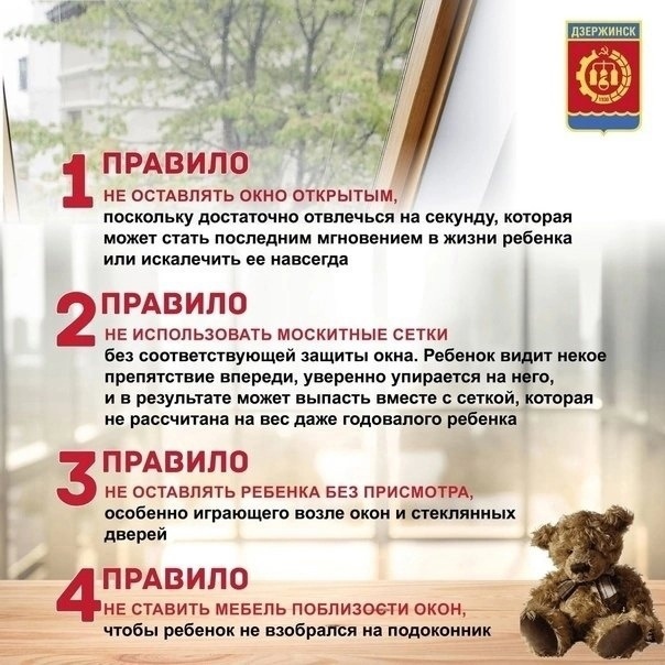 — не использовать москитные сетки без соответствующей защиты окна – дети воспринимают сетку как надежную опору, на которую можно опереться;